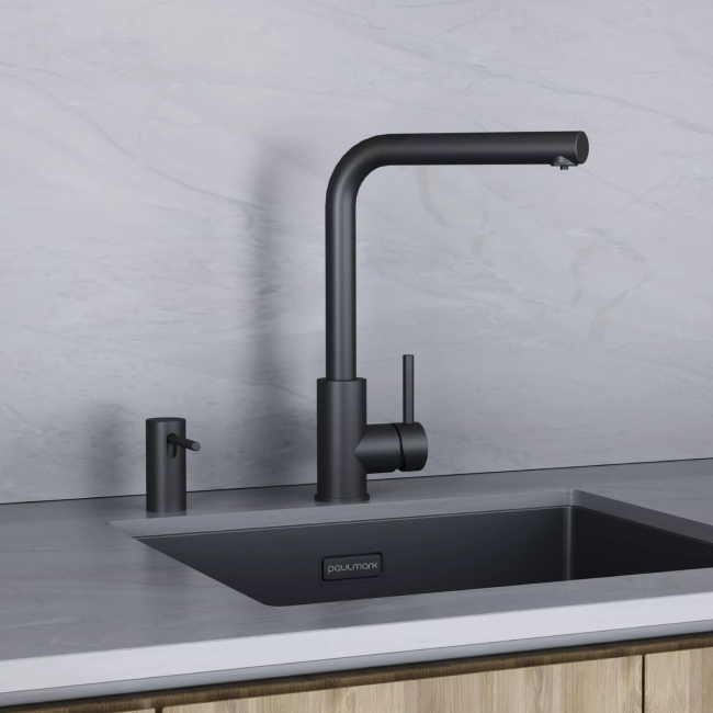 Стильный встраиваемый дозатор STORK для жидкого моющего средства совместим с любыми столешницами (толщиной до 55 мм) и любыми мойками.