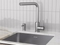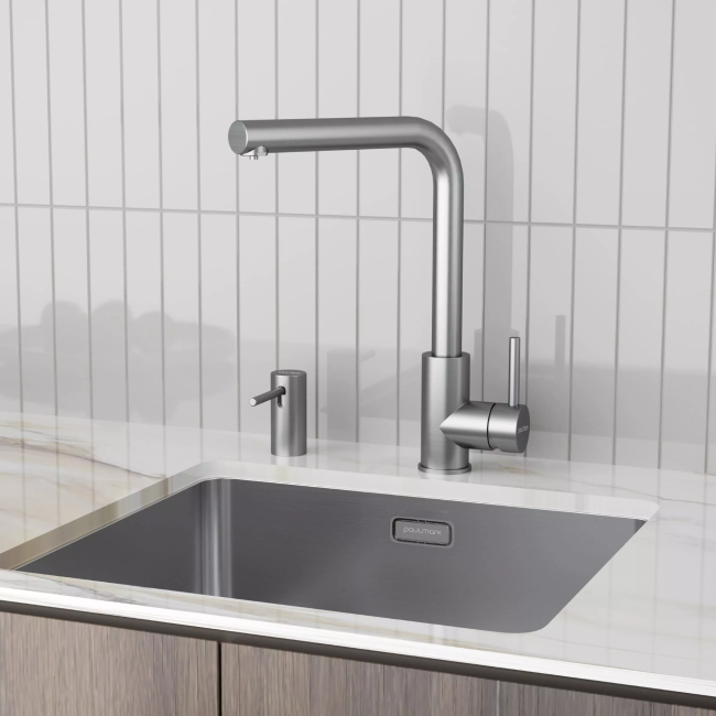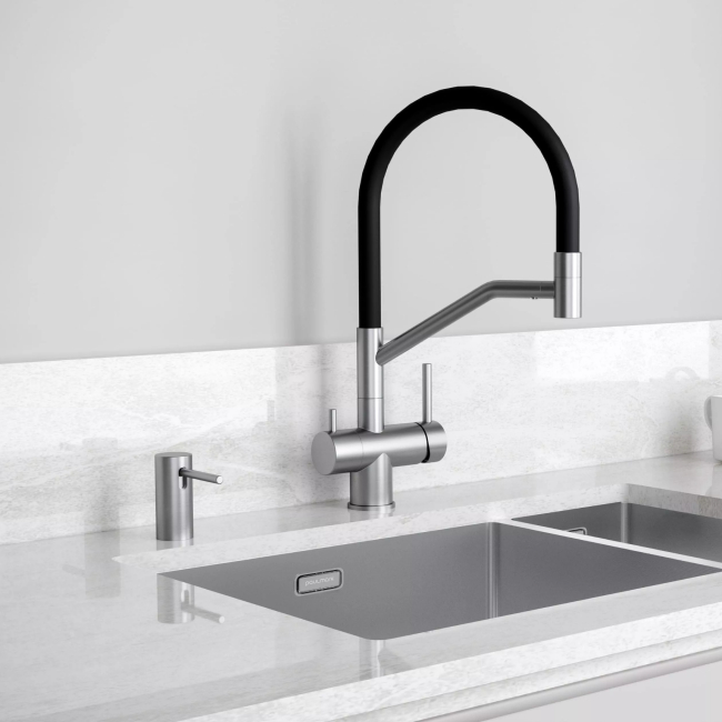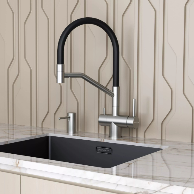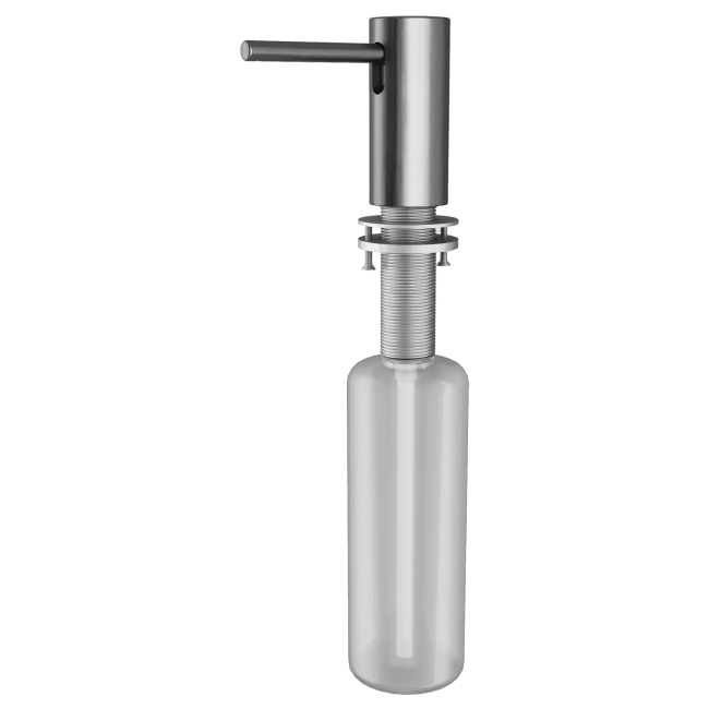 Стильный встраиваемый дозатор STORK для жидкого моющего средства совместим с любыми столешницами (толщиной до 55 мм) и любыми мойками.