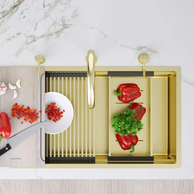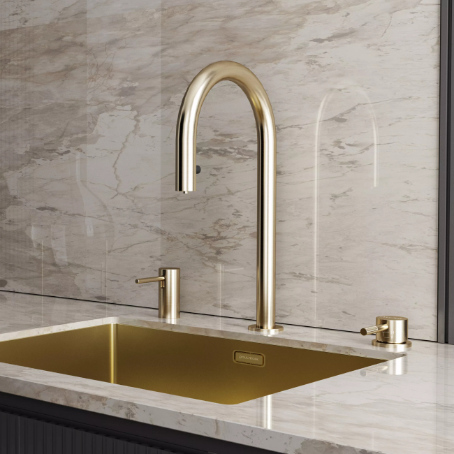 Стильный встраиваемый дозатор STORK для жидкого моющего средства совместим с любыми столешницами (толщиной до 55 мм) и любыми мойками.