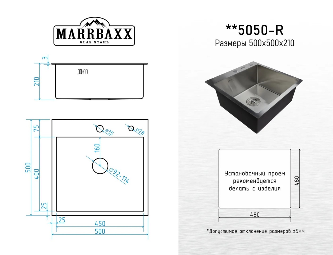 Габариты мойки: Длина: 500 мм; Ширина: 500 мм; Глубина чаши: 210 мм