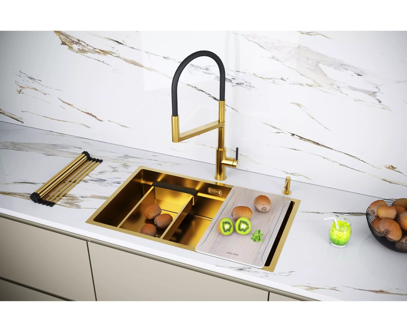 Мойка NEXT-MULTI SINK 74 UNI в цвете брашированное золото (BG) имеет прочное PVD покрытие, которое нанесено на нержавеющую сталь. Оно особенно устойчиво к появлению царапин и истиранию, не содержит микротрещин и является экологически чистым.