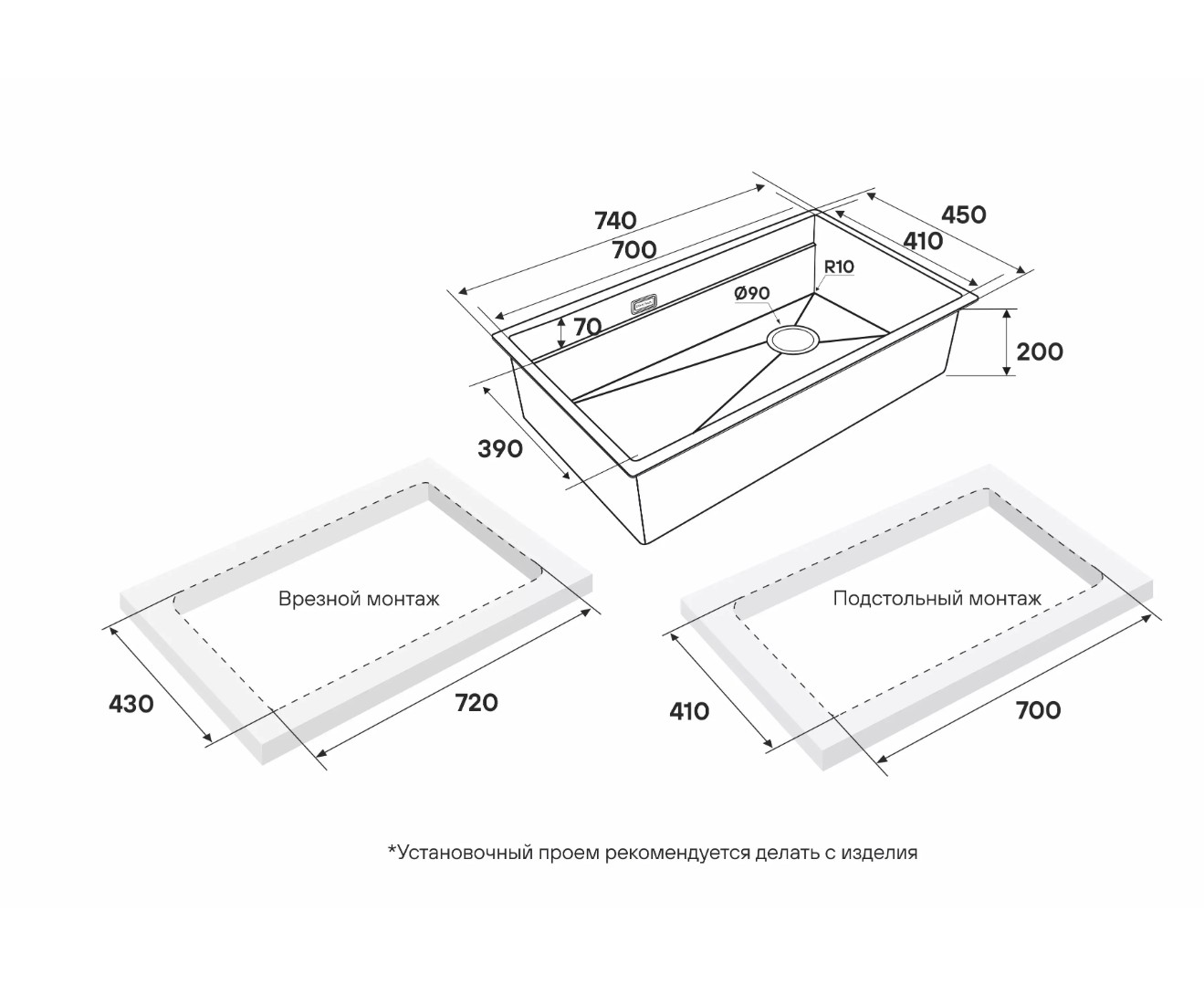 Толщина мойки 1,2 мм по всей поверхности. Ручной метод производства и ровный плоский кант мойки позволяют устанавливать NEXT-MULTI SINK 74 UNI поверх столешницы, подстольным способом, вровень со столешницей и «под ламинат».