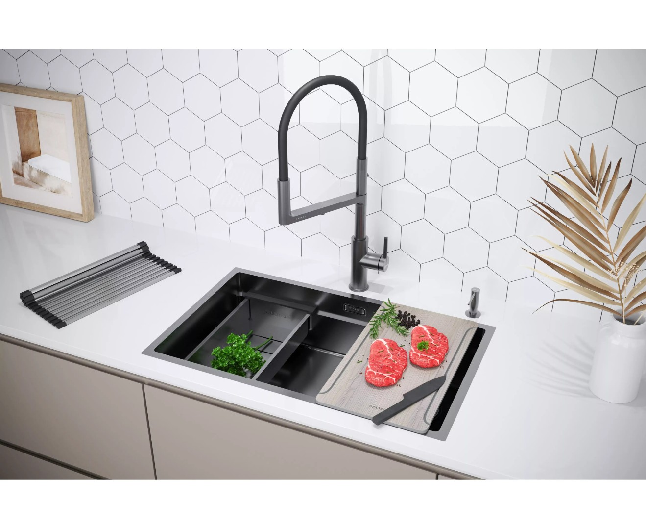 Трехуровневая мойка из нержавеющей стали NEXT-MULTI SINK 74 UNI разработана специально для использования вместе с аксессуарами, такими как ролл-мат, коландер, разделочная доска. Встроенный уступ в чаше мойки создает дополнительный уровень для установки аксессуаров. Таким образом, мойка становится единой точкой для подготовки продуктов перед их приготовлением. Мыть продукты, обсушивать их, нарезать и сразу перекладывать в кастрюлю или чашу пароварки можно находясь около мойки. Трехуровневая мойка NEXT-MULTI SINK 74 UNI помогает правильно организовать рабочее пространство.