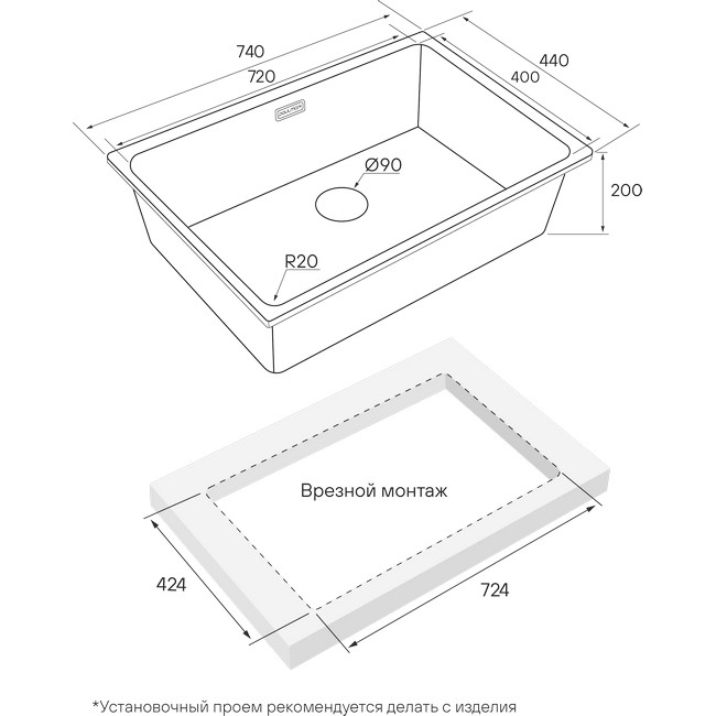 Монтаж: Мойки VISTA UNI могут быть установлены как врезным способом поверх столешницы, так и под столешницу (подстольный монтаж).