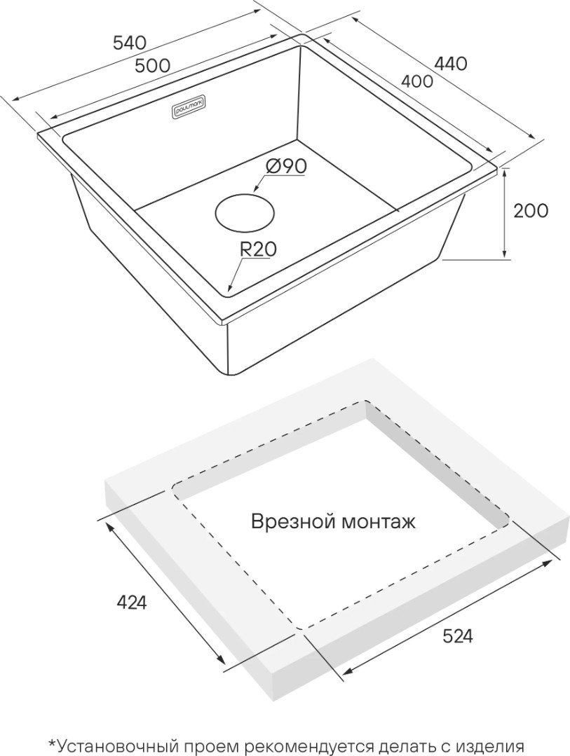 Монтаж: Мойки VISTA UNI могут быть установлены как врезным способом поверх столешницы, так и под столешницу (подстольный монтаж).