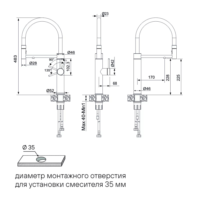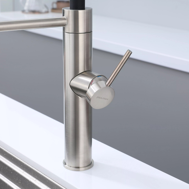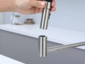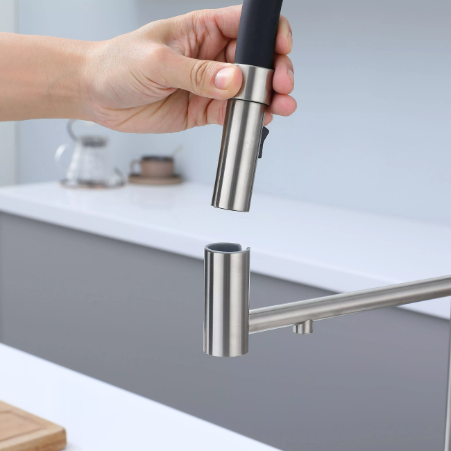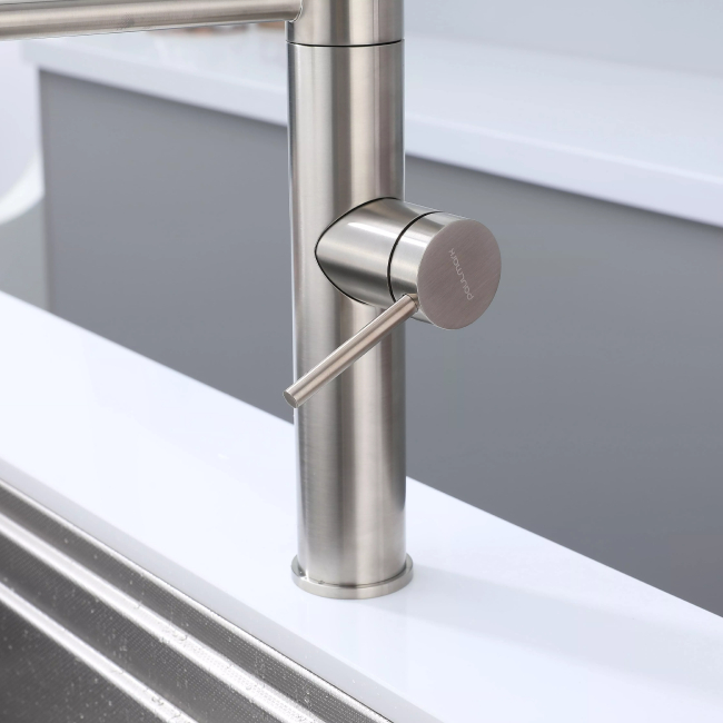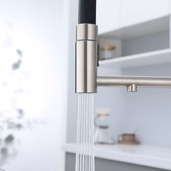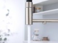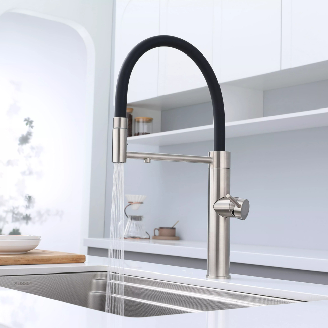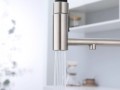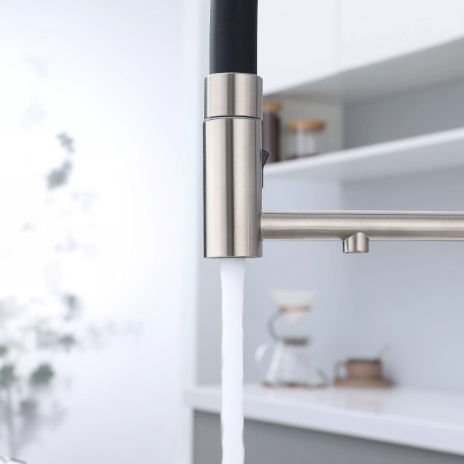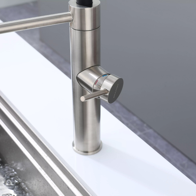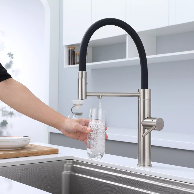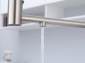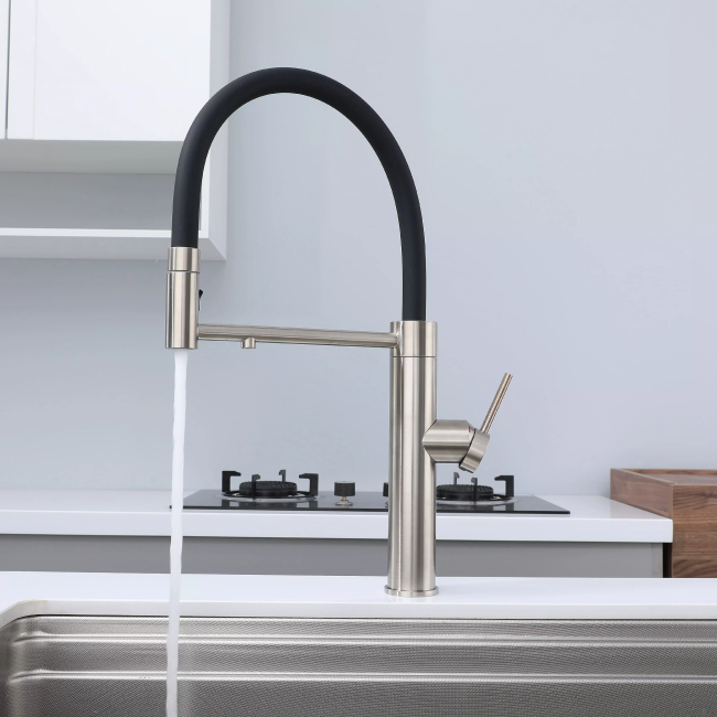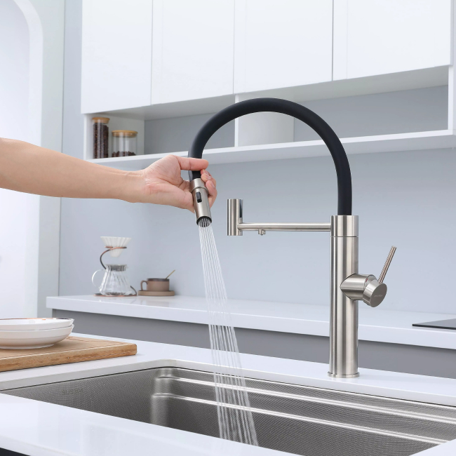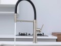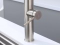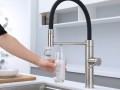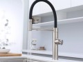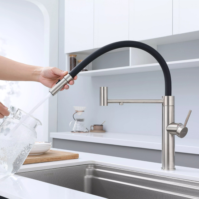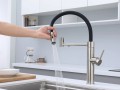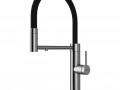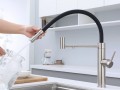 Смеситель для кухни GANYMEDE оснащен функциями подключения фильтра питьевой воды, гибким силиконовым изливом и функцией переключения режимов подачи воды струя/душ, управление которой производится кнопкой на конце излива. Гибкий излив фиксируется элементом корпуса в форме кольца.