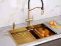Многофункциональный смеситель для кухни ZENDER оснащен функциями подключения фильтра питьевой воды и гибким силиконовым изливом с двумя режимами подачи водопроводной воды: струя и душ. Для переключения режимов струя / душ служит кнопка на конце излива. Управление питьевой водой производится поворотом ручки, расположенной слева. Питьевая вода подается из отдельного аэратора. Для удобства использования ручка управления питьевой водой имеет декоративные лазерные насечки.
