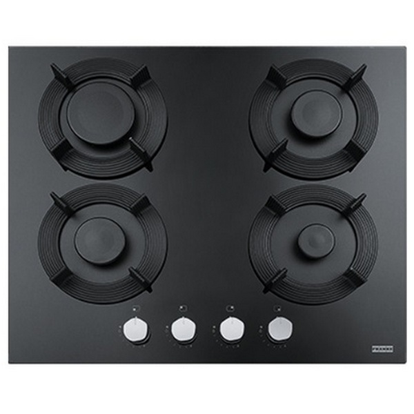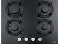 Газовая варочная поверхность, закаленное стекло, чугунные решетки, 4 газовые конфорки, электроподжиг, газ-контроль, цвет черный, рельефные поворотные ручки переключателей
