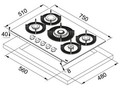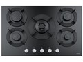 Газовая варочная поверхность, закаленное стекло, чугунные решетки, 5 газовых конфорок, электроподжиг, газ-контроль, цвет черный, рельефные поворотные ручки переключателей