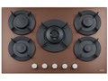 Газовая варочная поверхность, закаленное стекло, чугунные решетки, 5 газовых конфорок, электроподжиг, газ-контроль, цвет медный золотой, рельефные поворотные ручки переключателей, медный золотой