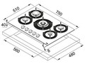 Газовая варочная поверхность, закаленное стекло, чугунные решетки, 5 газовых конфорок, электроподжиг, газ-контроль, цвет миндаль, рельефные поворотные ручки переключателей