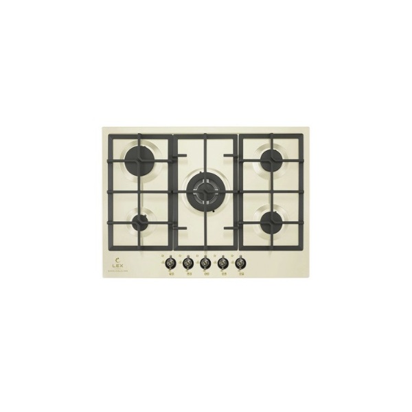 Газовая варочная поверхность, эмалированная сталь, чугунные решетки, 5 газовых конфорки, электроподжиг, газ-контроль, цвет - слоновая кость
