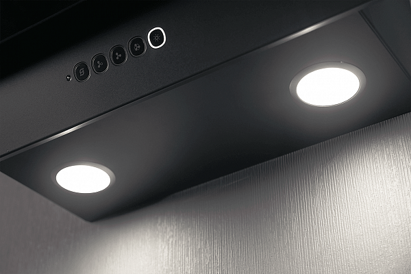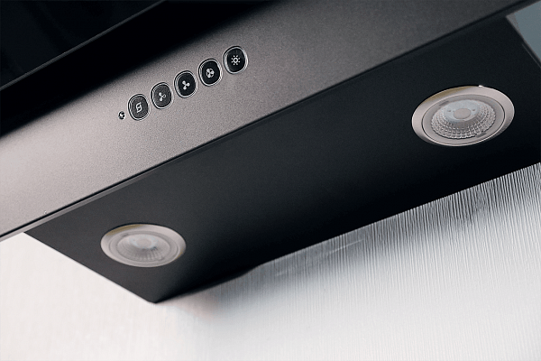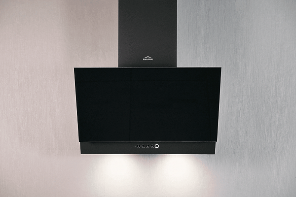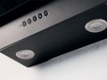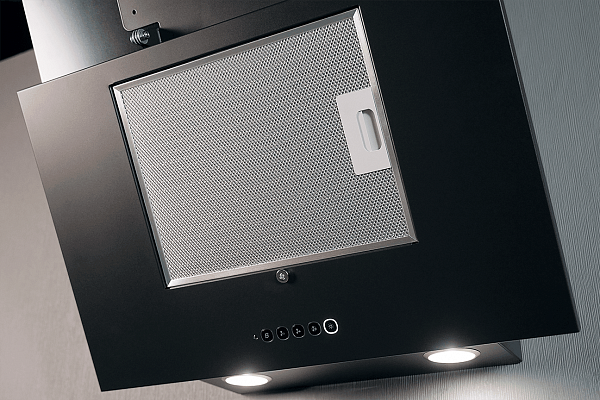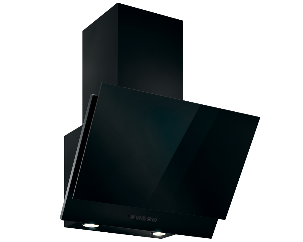 Вытяжка кухонная, пристенная,наклонная. Исполнение: черный/черное стекло. Управление: сенсорное. Режим работы: отвод. Угольный фильтр - временно не поставляется. Отвод возможен только через вентканал.