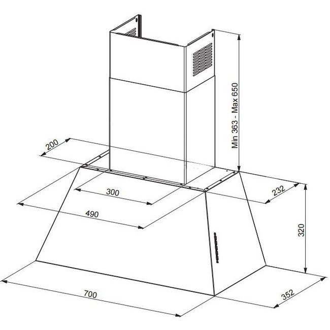 Высота: 68.3 см Ширина: 70 см Глубина: 35.2 см Максимальная высота: 97 см Габариты: 68.3-97 х 70 х 35.2 см Материал: окрашенный металл Режимы работы: отвод / рециркуляция Элементы кнопочные Интенсивный режим Аспирация по периметру Дистанционное управление Индикатор загрязнения фильтра Режим Hour (24 часа) Таймер Частота: 50/60 Гц Количество двигателей: 1 Мотор: Evo Комплектация: Пульт управления, Декоративный дымоход