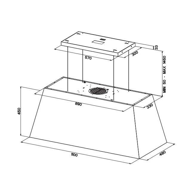 Высота: 56.3 см Ширина: 110 см Глубина: 48 см Максимальная высота: 196.3 см Габариты: 56.3-196.3 х 110 х 48 см Режимы работы: отвод / рециркуляция Элементы кнопочные Частота: 50/60 Гц Количество двигателей: 1 Мотор: Energy