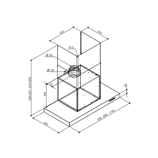 Высота: 54.5 см Ширина: 59.8 см Глубина: 45 см Максимальная высота: 85 см Габариты: 54.5-85 х 59.8 х 45 см Материал: нержавеющая сталь Режимы работы: отвод / рециркуляция Элементы сенсорные Интенсивный режим Дистанционное управление Частота: 50/60 Гц Количество двигателей: 1 Система Steam-Off