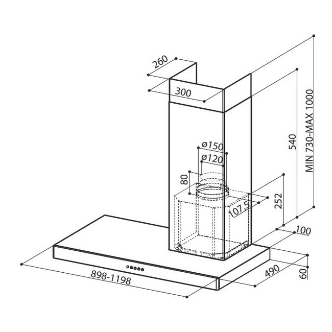 Высота: 79 см Ширина: 119.8 см Глубина: 49 см Максимальная высота: 106 см Габариты: 79-106 х 119.8 х 49 см Материал: нержавеющая сталь Режимы работы: отвод / рециркуляция Элементы кнопочные Возможность работы с внешним мотором Remote Blower Частота: 50/60 Гц Количество двигателей: 1 Мотор: Evo