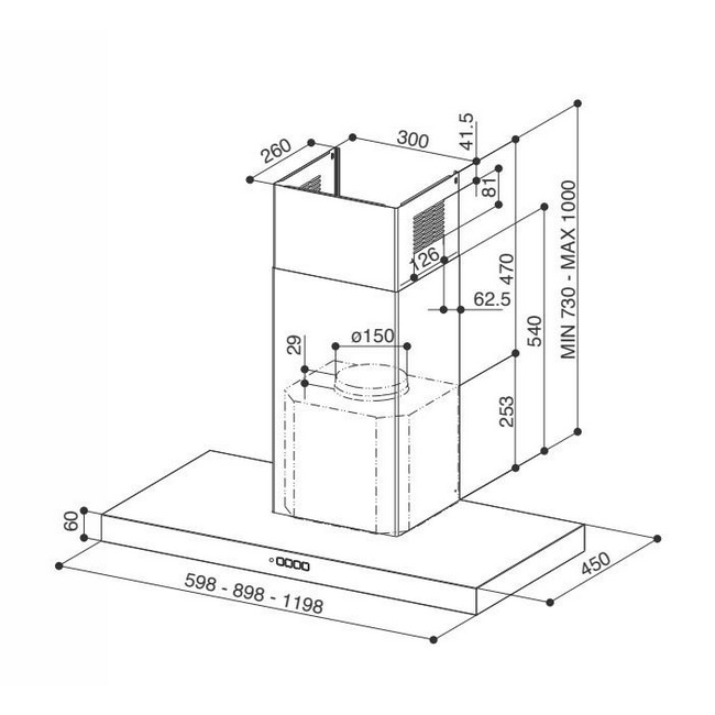 Высота: 73 см Ширина: 119.8 см Глубина: 45 см Максимальная высота: 100 см Габариты: 73-100 х 119.8 х 45 см Материал: нержавеющая сталь Режимы работы: отвод / рециркуляция Элементы кнопочные Интенсивный режим Возможность работы с внешним мотором Remote Blower Частота: 50/60 Гц Количество двигателей: 1 Мотор: Energy