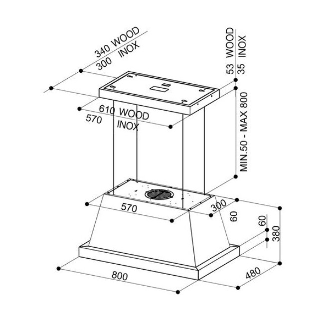 Высота: 48.3 см Ширина: 80 см Глубина: 48 см Максимальная высота: 118 см Габариты: 48.3-123.3 х 80 х 48 см Режимы работы: отвод Элементы кнопочные Интенсивный режим Частота: 50/60 Гц Количество двигателей: 1 Мотор: Evo